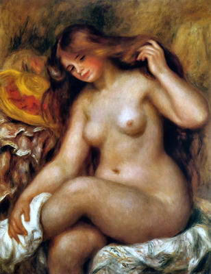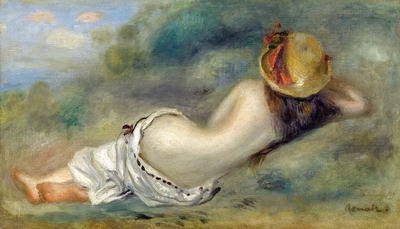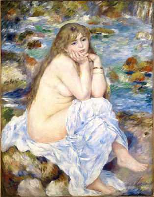 Большое влияние на творчество художника оказывают путешествия: несколько раз он посещает Северную Африку, Италию, Англию. После этого в картинах Ренуара начинают преобладать зеленоватые и голубоватые оттенки, а линии становятся более четкими и жесткими. В 1880-х годах художник обращается к обнаженной натуре с преобладанием персикового и розового оттенка. Эти картины привлекают красочностью, колоритностью, живым выражением лиц и полным отсутствием пошлости. Знаковая работа этого периода – «Обнаженная» или «Нагая женщина, сидящая на кушетке». На кушетке в розово-зеленую полоску сидит обнаженная женщина. Ее немного полная фигура не соответствует канонам женской красоты, но она полна сил, здоровья и молодости – именно таково представление художника о прекрасном. В своих портретах Ренуар не пытается дать психологическую характеристику персонажа, а здесь этого и не надо. Модель покоряет нас не своим характером, а своей чувственной красотой, плавностью движений, свежестью ее розового лица, пышной копной темных волос. Ренуара часто обращался к обнаженной натуре, и все эти картины притягивают зрителя. Среди них стоит отметить «Обнаженную в солнечном свете» (1876), «Лежащую обнаженную» (1890), «Купальщицу в скалах» (1892), «Спящую» (1897).