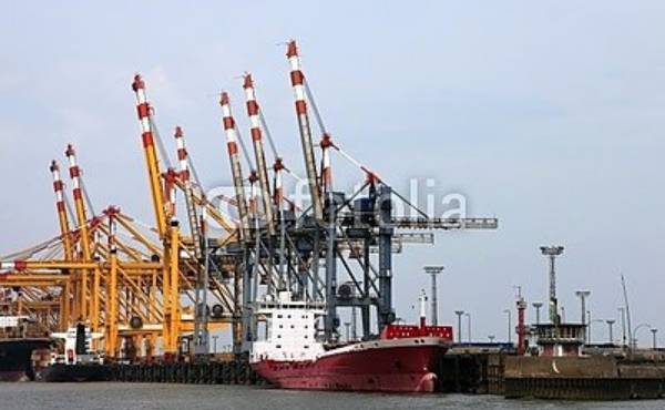 Красный контейнеровоз в контейнерном порту
